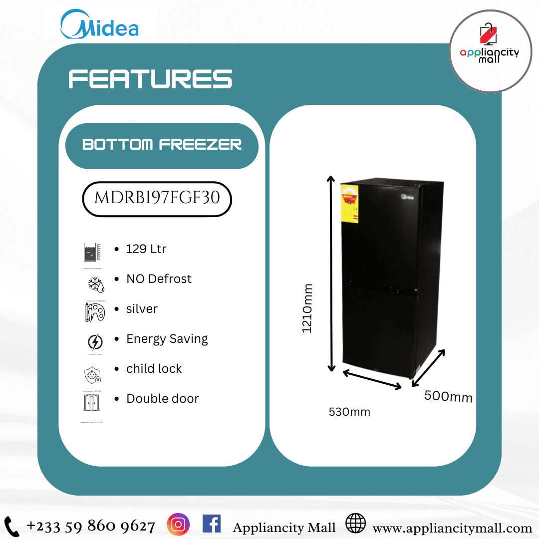 The Midea 129Lt Double Door Bottom Freezer[ is the ideal choice for anyone looking for a stylish, efficient, and user-friendly refrigeration solution. With its spacious design, practical features, and modern aesthetics, this refrigerator ensures that your food stays fresh while enhancing the overall look of your kitchen. Upgrade your home with Midea and enjoy the perfect blend of performance, convenience, and style!