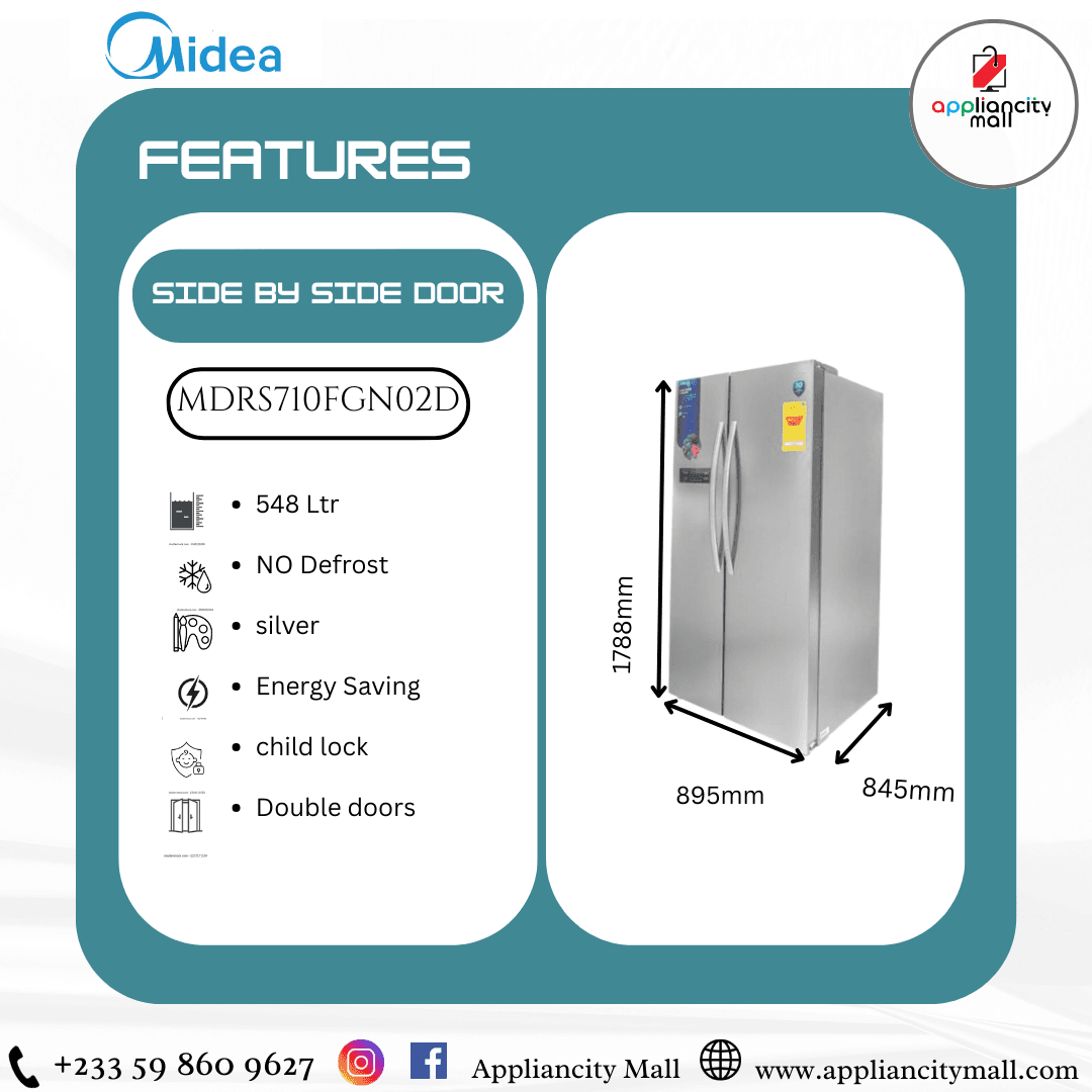 Elevate your kitchen with the Midea 548Ltrs Side By Side Fridge[MDRS710FGN02D], a perfect blend of style, functionality, and advanced technology. Designed for modern households, this spacious side-by-side fridge offers an abundance of storage space, making it easy to organize and access all your groceries and essentials.