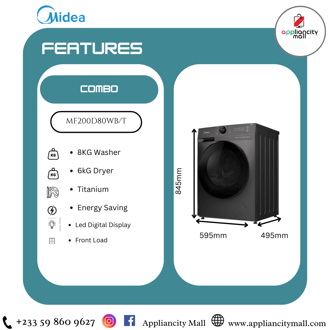 The Midea Combo 8KG Washer 6KG Dryer[MF200D80WB/T] is the ultimate all-in-one laundry solution, offering powerful cleaning, efficient drying, and advanced steam care in a fully automatic design. Perfect for families seeking convenience, hygiene, and fabric care, this machine makes laundry effortless and effective. Experience the perfect blend of technology and ease with Midea and enjoy fresh, clean clothes every day!