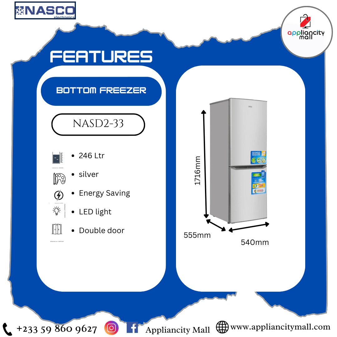The Nasco 246L Bottom Freezer Refrigerator NASD2-33 is not just an appliance; it’s a solution for modern living. Combining style, functionality, and energy efficiency, this refrigerator is the perfect companion for your kitchen, helping you keep your food fresh and your space organized. Make the smart choice today and elevate your culinary experience with Nasco.
